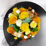 Цей прекрасний букет у теплих тонах поєднує елегантність жовтих троянд зі свіжістю гвоздик і хризантем у кремових та помаранчевих відтінках. Помаранчеві ягоди додають яскравий акцент, що контрастує з зеленню листя. Ідеальний для святкування особливих моментів або для того, щоб освітлити будь-який простір, цей букет, сповнений енергії та кольору, є ідеальним вибором, щоб скрасити день когось особливого.