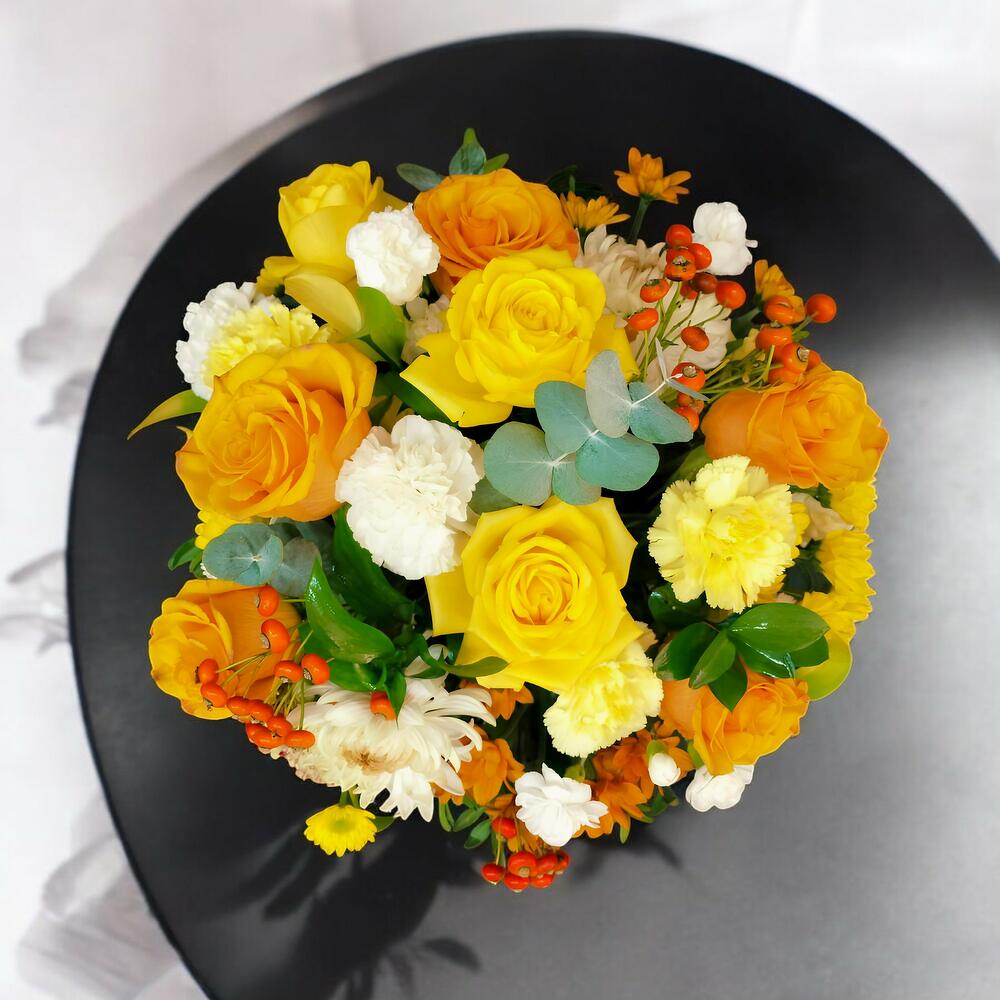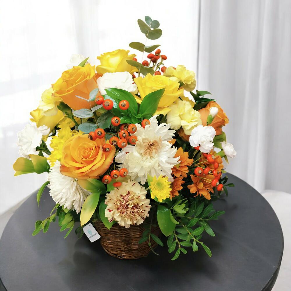 Цей прекрасний букет у теплих тонах поєднує елегантність жовтих троянд зі свіжістю гвоздик і хризантем у кремових та помаранчевих відтінках. Помаранчеві ягоди додають яскравий акцент, що контрастує з зеленню листя. Ідеальний для святкування особливих моментів або для того, щоб освітлити будь-який простір, цей букет, сповнений енергії та кольору, є ідеальним вибором, щоб скрасити день когось особливого.