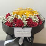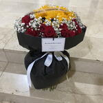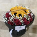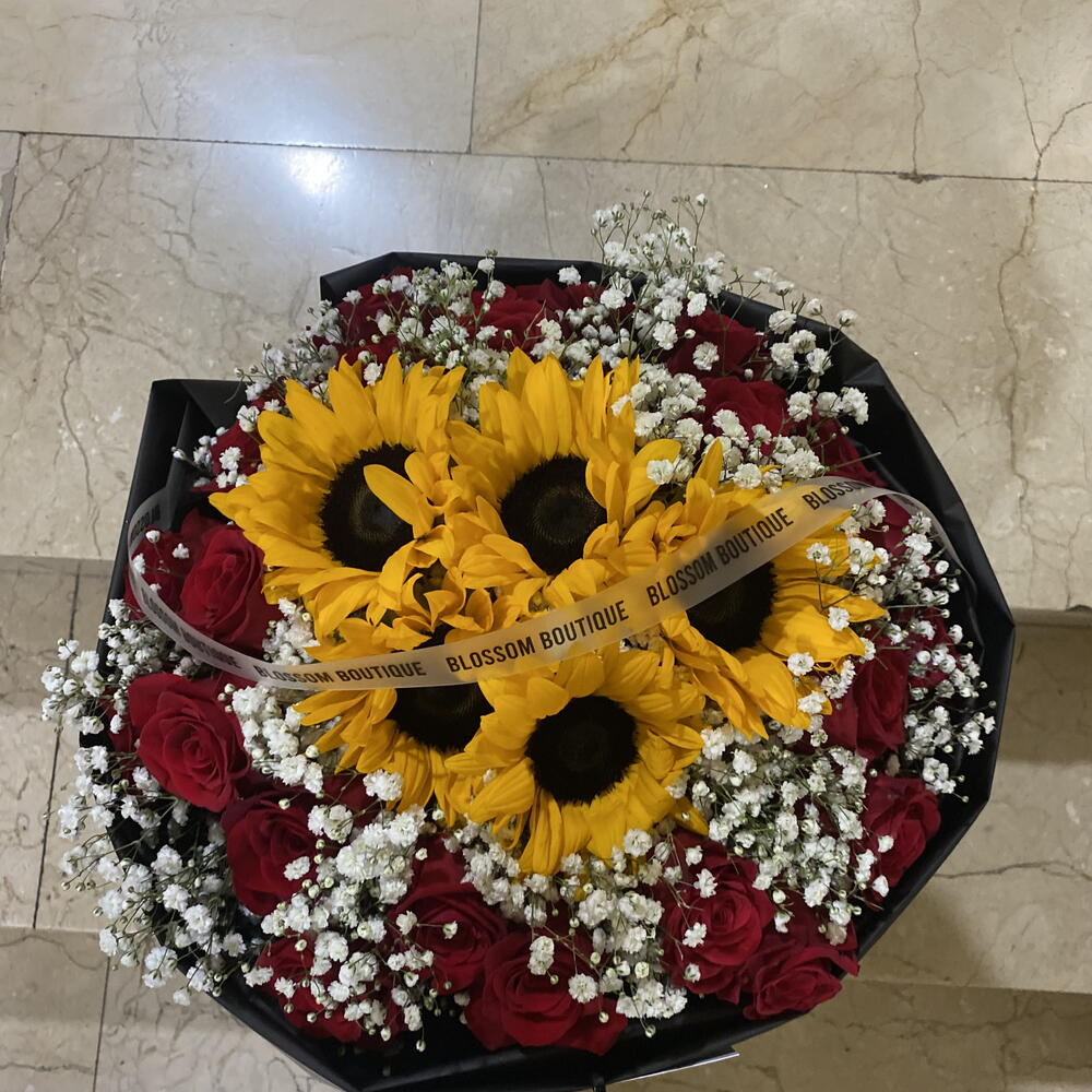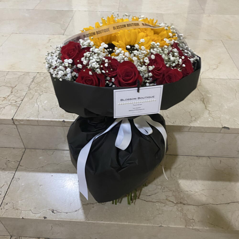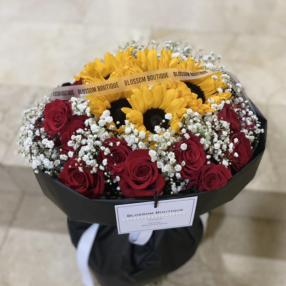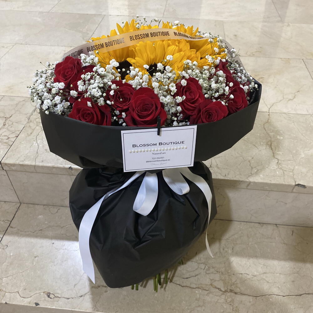 paniculata - 15 шт. rosas rojas - 24 шт. середні соняшники - 5 шт. біла стрічка - 80 см чорний матовий папір - 100 см стрічка бренду - 50 см картка бренду з перлинною стрічкою - 1 шт.