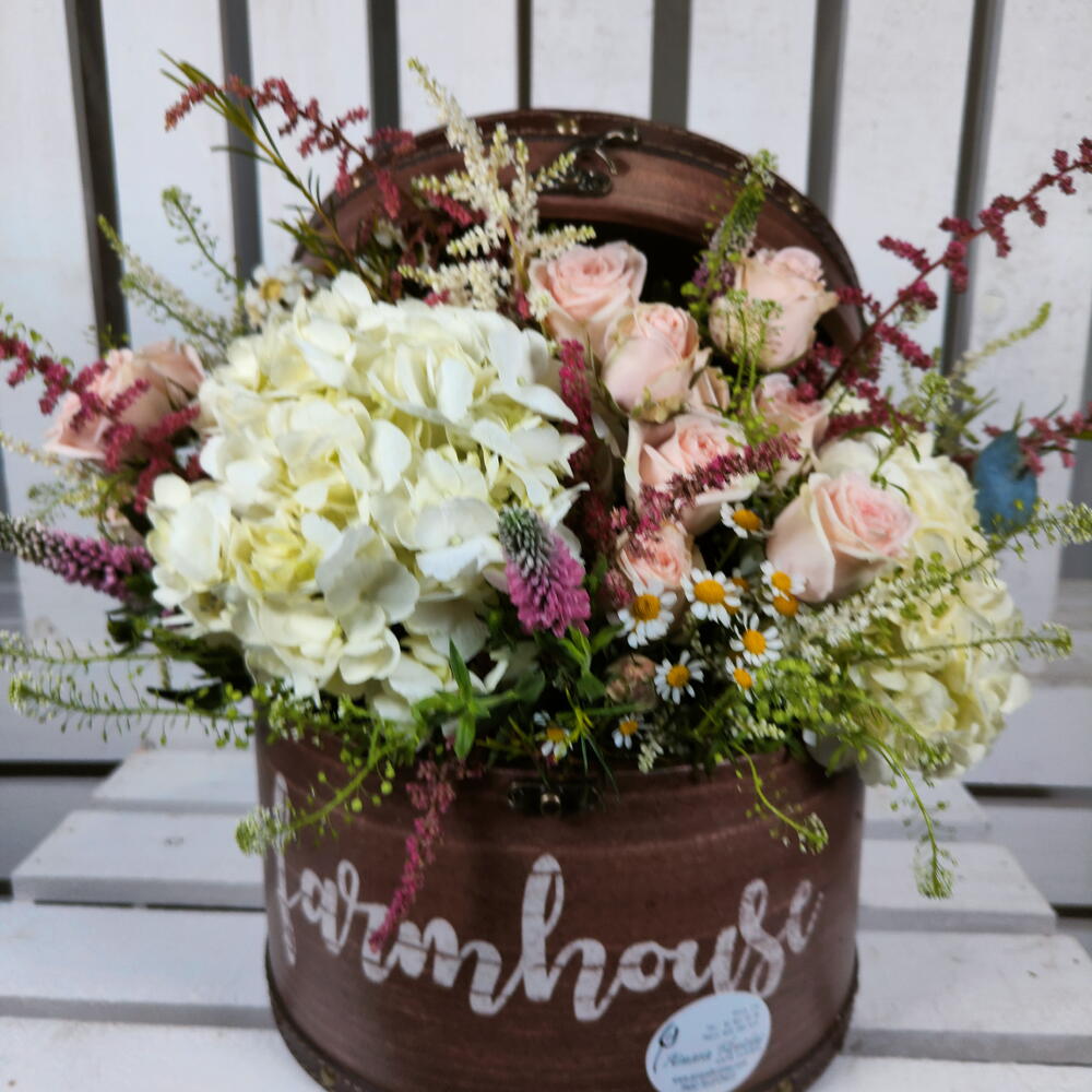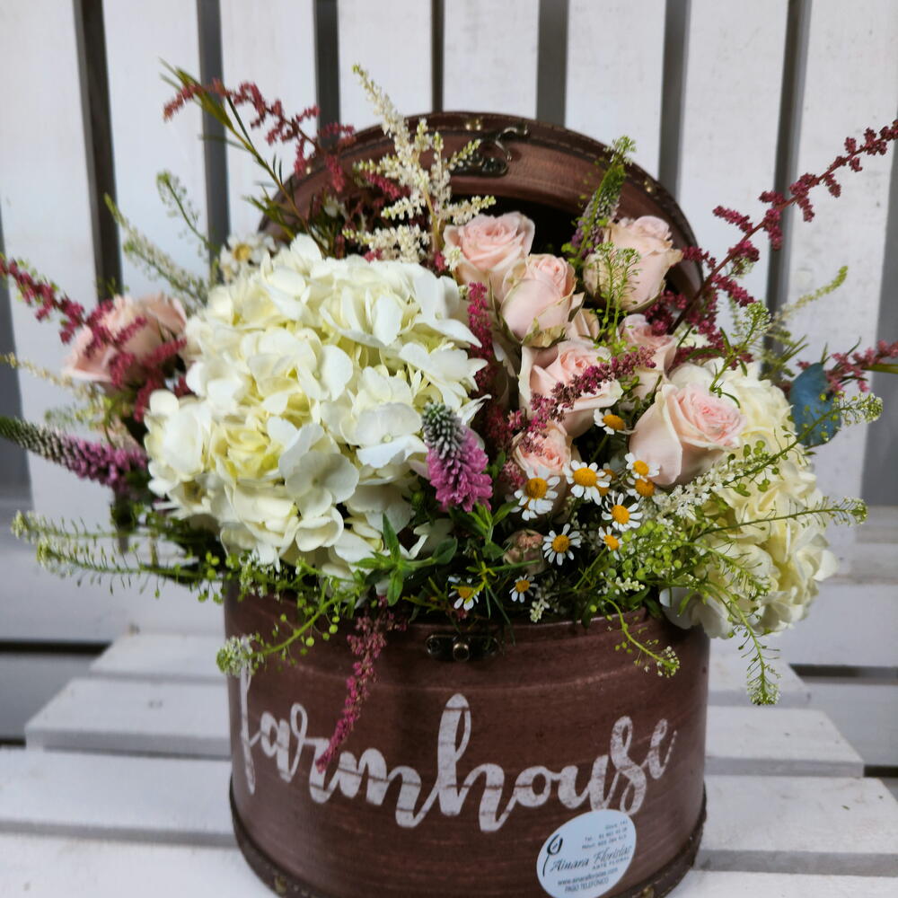 Veronica - 5 шт. oasis floral - 3 шт. astilbe - 5 шт. phalaris - 4 шт. verdes variados - 4 шт. rosas spray - 5 шт. білі гортензії - 2 шт. шляпна коробка - 1 шт.
