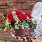 Este elegante centro de flores es un arco iris de naturaleza que adorna cualquier lugar. Compuesto por dos eucaliptos refrescantes, dos delicadas paniculatas, siete rosas rojas vibran con su color y una sombrerera rosa para un toque suave y femenino. Todo está cuidadosamente dispuesto para crear un escenario floral hermoso y atractivo. Perfecto para alegrar su hogar o para un regalo considerado.