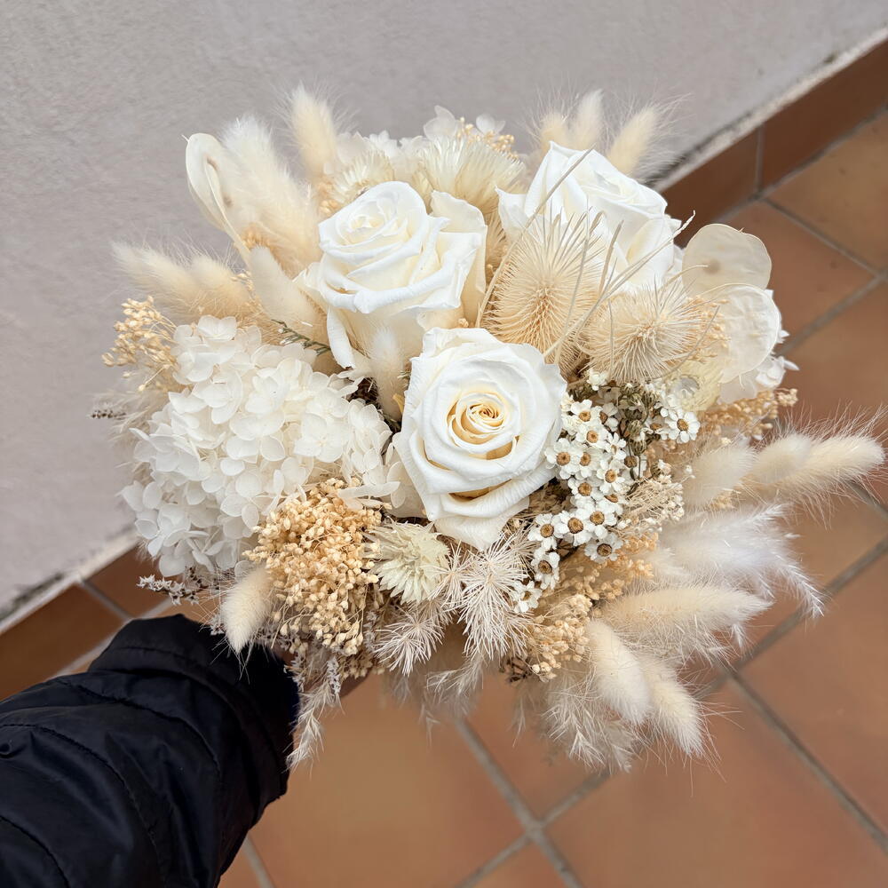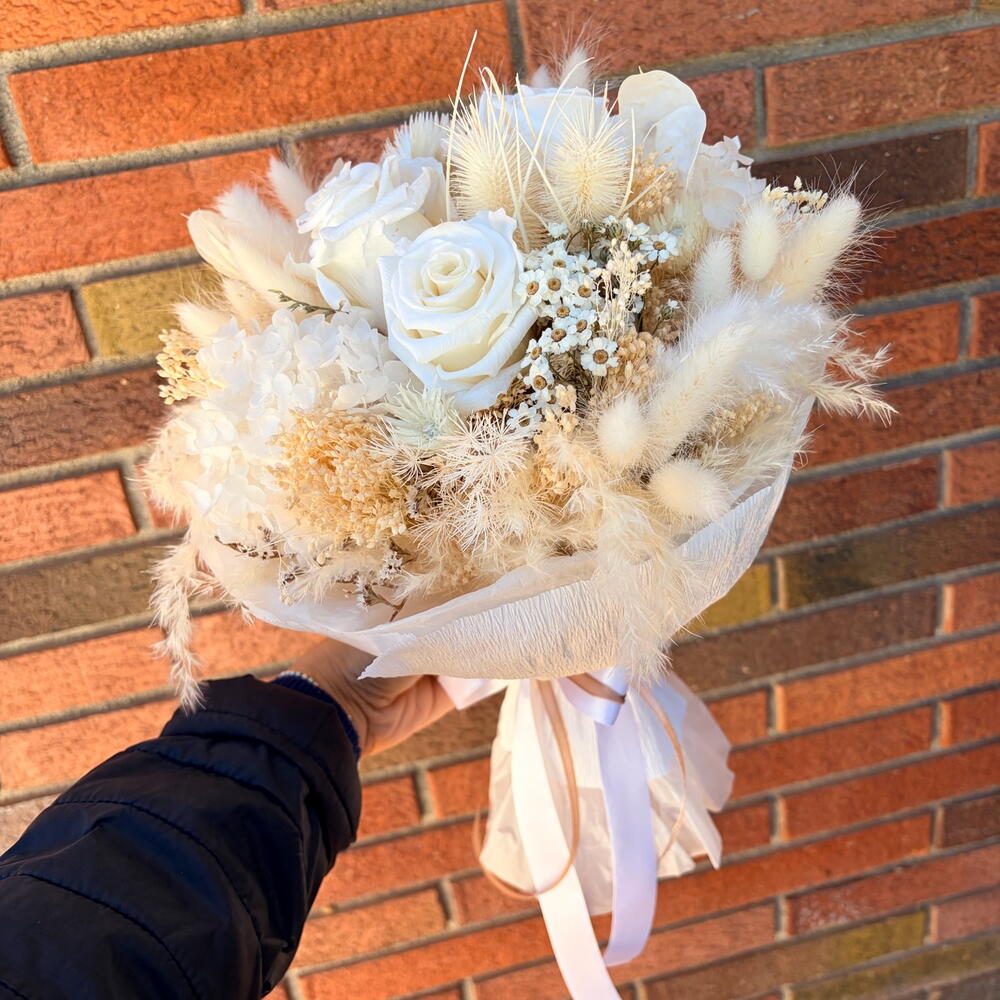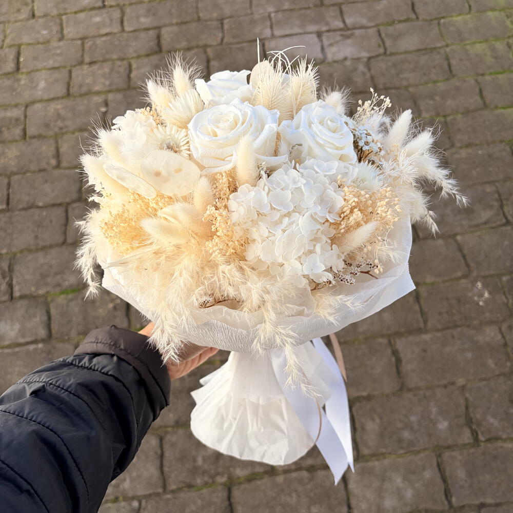 Зоряна мрія — подарунок, який триватиме вічно. Виготовлений вручну в Барселоні, цей розкішний букет містить троянду, яка не вмирає. Використовуючи передові технології зберігання, ми створили монохромний шедевр із чисто білих троянд та хмароподібних гортензій, які збережуть свою красу роками. Акцентований архітектурними білими ехінопсами та мерехтливими лунаріями, цей букет є стійким, не потребуючим догляду витвором флористичного мистецтва. Без води, без в'янення — лише постійна біла мрія. • Довговічність: від 1 до 3 років. • Догляд: Не потребує води. Зберігати в сухому місці, захищеному від прямих сонячних променів. • Найкраще підходить для: розкішного декору дому, річниць або позачасового сюрпризу на день народження.
