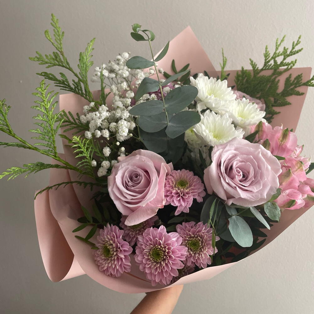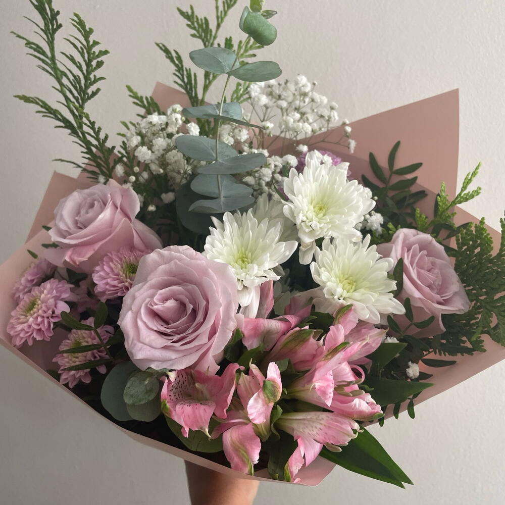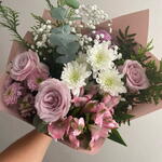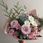 alstroemeria rosa - 1 шт. біла маргаритка - 1 шт. панікулата біла - 1 шт. рожева маргаритка - 2 шт. декоративна зелень (фоліаж) - 1 шт. троянди рожеві двоколірні бузкові - 3 шт.