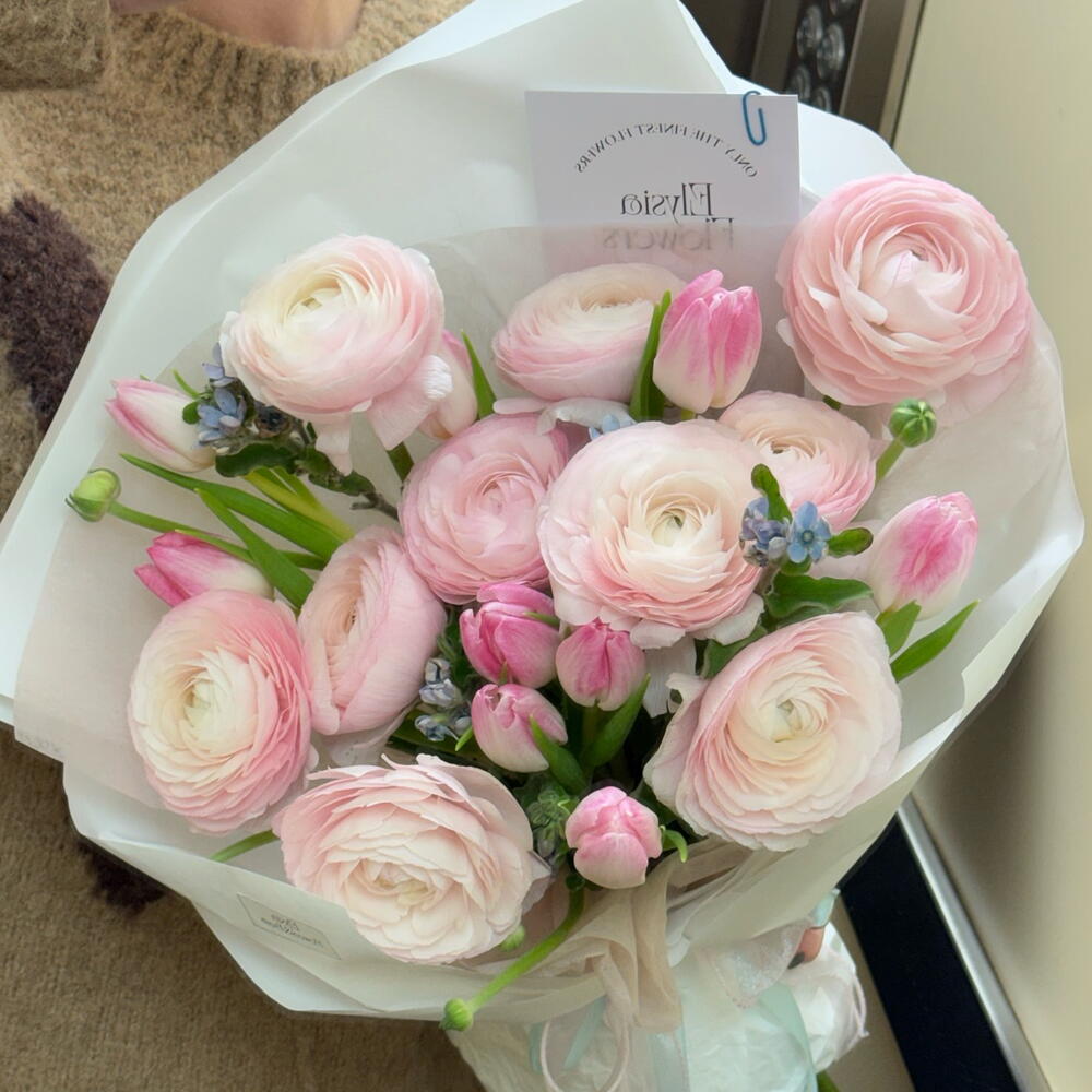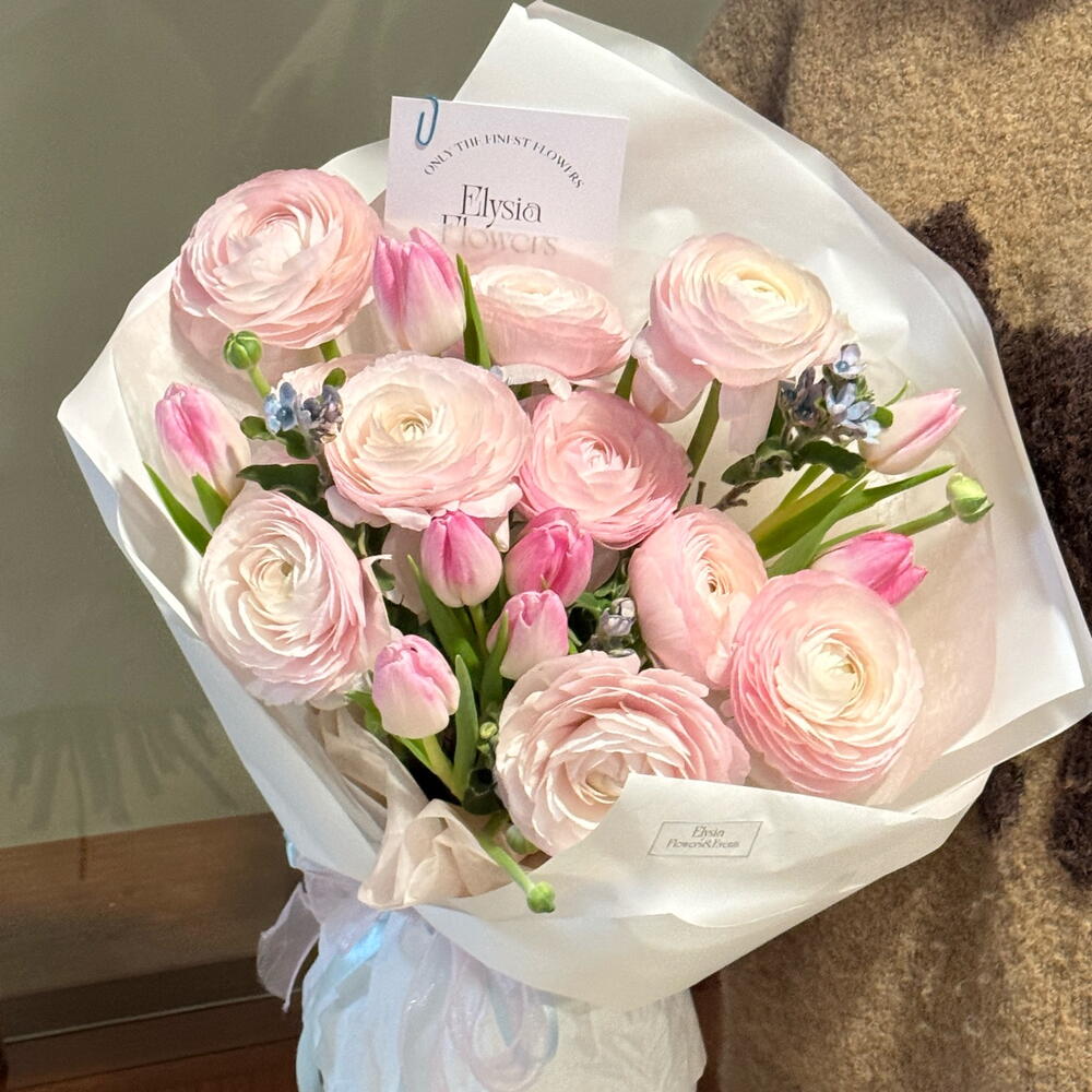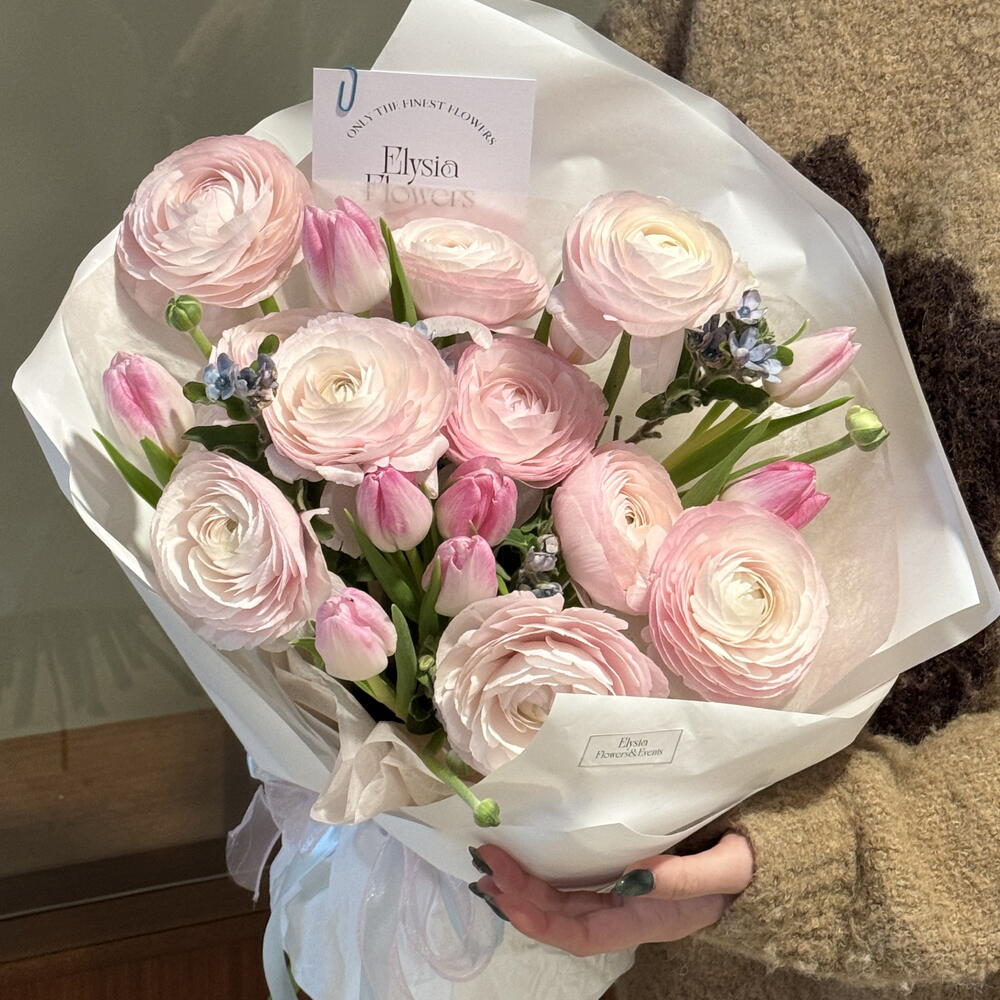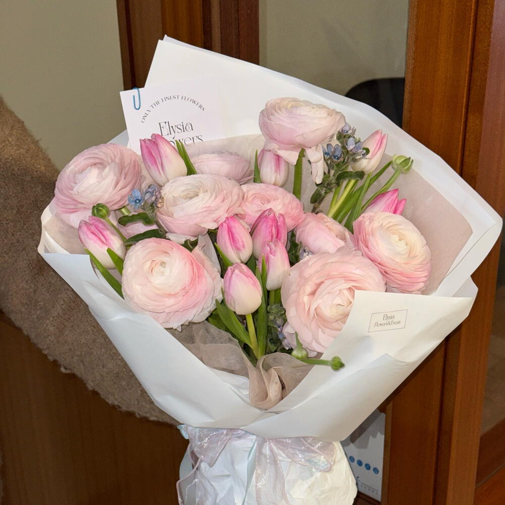 Сезонна, найніжніша композиція ранункулюсів Hanoi і рожевих тюльпанів. Справжня перлина для поціновувачів! Кожен букет в Elysia Flowers зроблений з любов'ю та турботою. До ваших квітів ми додаємо підживку для квітів та інструкцію з догляду.