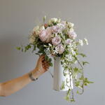 Цей ніжний букет поєднує м'які відтінки рожевого та лілового, що передають романтичність і елегантність. Троянди та еустома створюють оксамитний об'єм, тоді як білі квіти та звисле листя додають легкості та руху. Це ідеальна композиція для дня народження, річниць, інтимних весіль, романтичних зізнань або як витончений жест подяки. Його природний і злегка дикорослий стиль робить його декоративним акцентом, що пасує до будь-якого простору. Щоб зберегти свіжість, поставте букет у прохолодне місце, уникайте прямого сонячного світла і міняйте воду кожні два дні. Також рекомендується зрізати стебла під кутом перед тим, як знову поставити їх у воду, та видаляти листя, яке опиняється під водою.