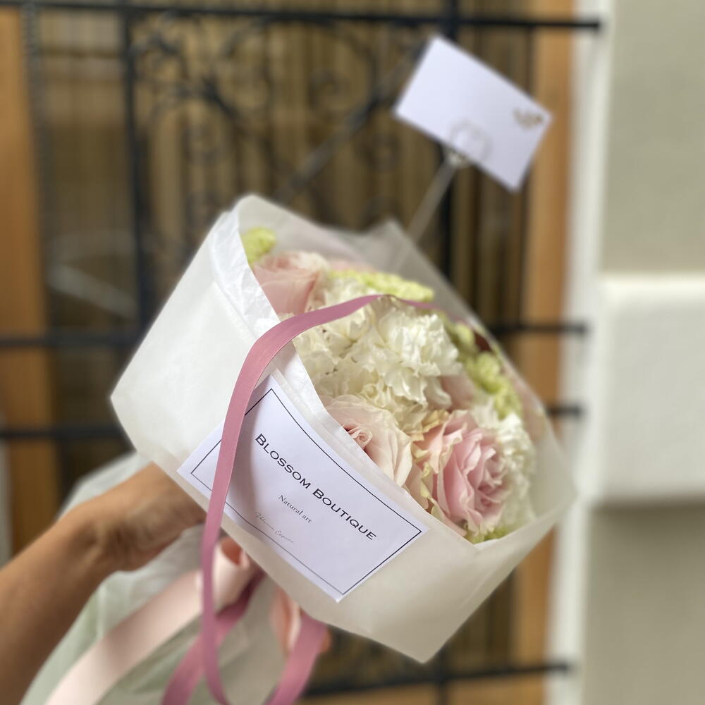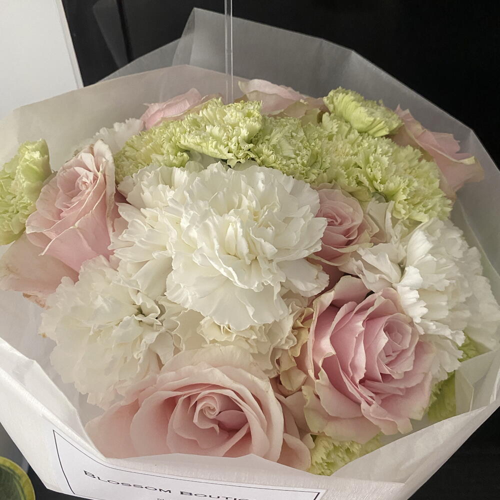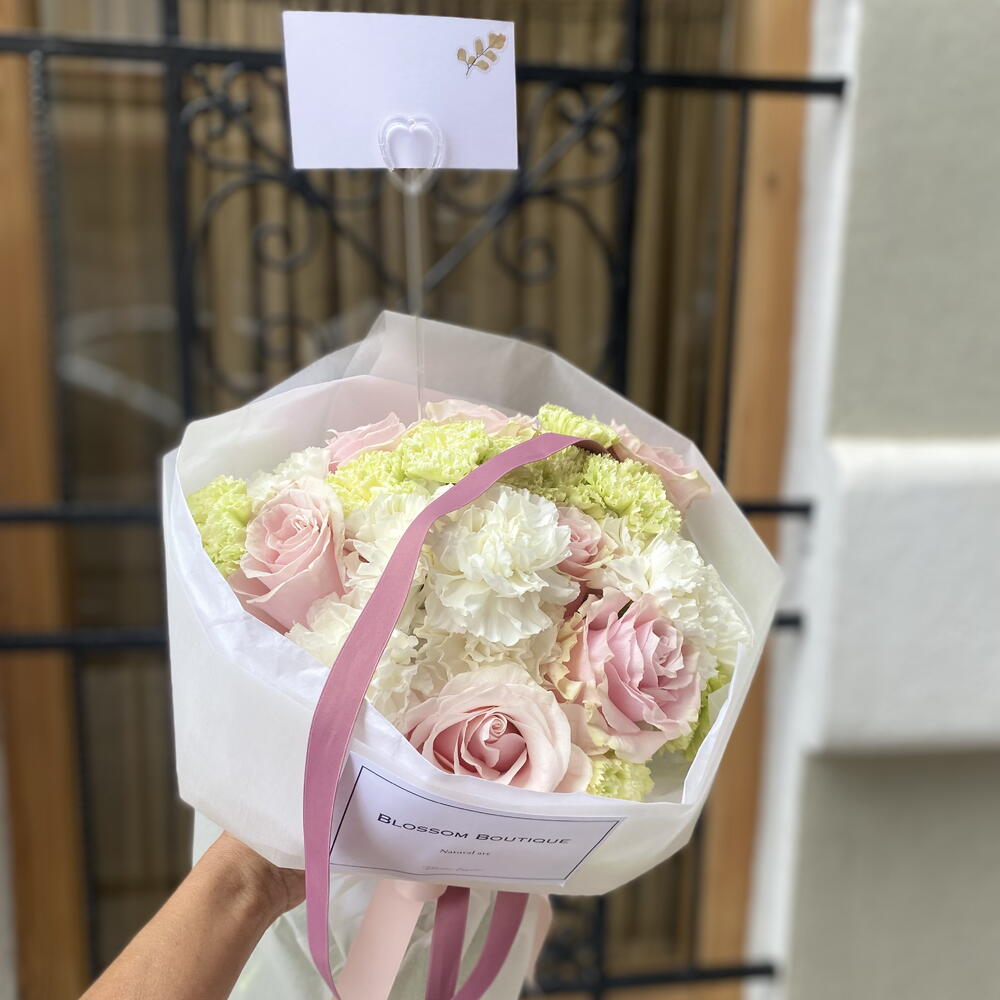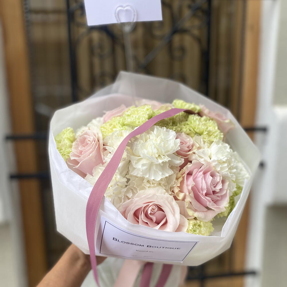Цей букет створений для тих, хто шукає більше, ніж просто квіти: візуальний досвід. Центральним елементом є вісім троянд сорту «Солодка Кароліна», відомих своїм ніжним пильно-рожевим відтінком та класичною формою, оточені гармонійним поєднанням дванадцяти преміальних гвоздик чисто білого та яскраво-зеленого кольорів. Детальний склад: • 8 троянд сорту «Солодка Кароліна»: Високоякісні троянди з оксамитовими пелюстками. • 12 гвоздик: Збалансоване поєднання весільного білого та лаймово-зеленого кольорів для свіжості та об'єму. • Розкішна презентація: Ручна обгортка в паперові серветки з водонепроникною зовнішньою стороною, запечатана логотипом Blossom Boutique та атласною стрічкою в тон.