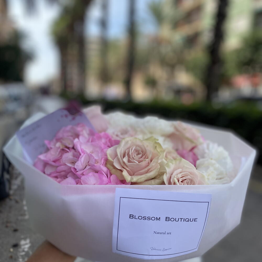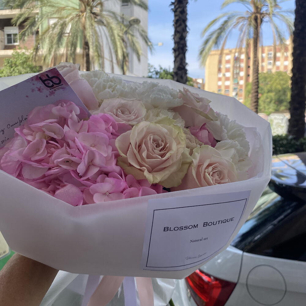 Ніжність і вишуканість. Це композиція, створена, щоб передавати ніжність і радість на будь-яку нагоду. Цей ексклюзивний дизайн поєднує унікальні текстури та об’єми: • 11 пастельно-рожевих троянд. • 2 фуксійні гортензії: додають яскравості та ефектної пухкої форми. • 12 білих гвоздик: символізують чистоту і надають композиції виняткової довговічності. Чому варто обрати його? Поданий у ніжній преміальній упаковці, що підкреслює свіжість кожної пелюстки, цей букет ідеально підходить для річниць, днів народження або просто щоб освітлити день близької людини. Його палітра ніжних кольорів робить його ідеальним декоративним елементом для будь-якого простору.