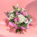 Букет «Touch of Pink» – це чарівне поєднання, що викликає враження свіжості, краси та спокою. З трьома білими ліліями та трьома рожевими герберами в центрі, цей букет випромінює ніжність та елегантність. Біла гортензія та маленькі квіти гіпсофілі (гіпсофіла) додають композиції м'якості та легкості, а зелені гілочки папороті привносять свіжість та гармонію. Рожевий колір гербер та бузку робить цей букет яскравим та живим вибором. Ідеально підходить для будь-якого особливого свята, будь то день народження, подяка чи романтичний момент. «Touch of Pink» – це квітковий шедевр, який освітить будь-який простір своєю свіжістю та неповторною красою.