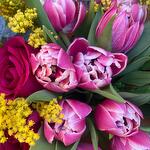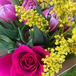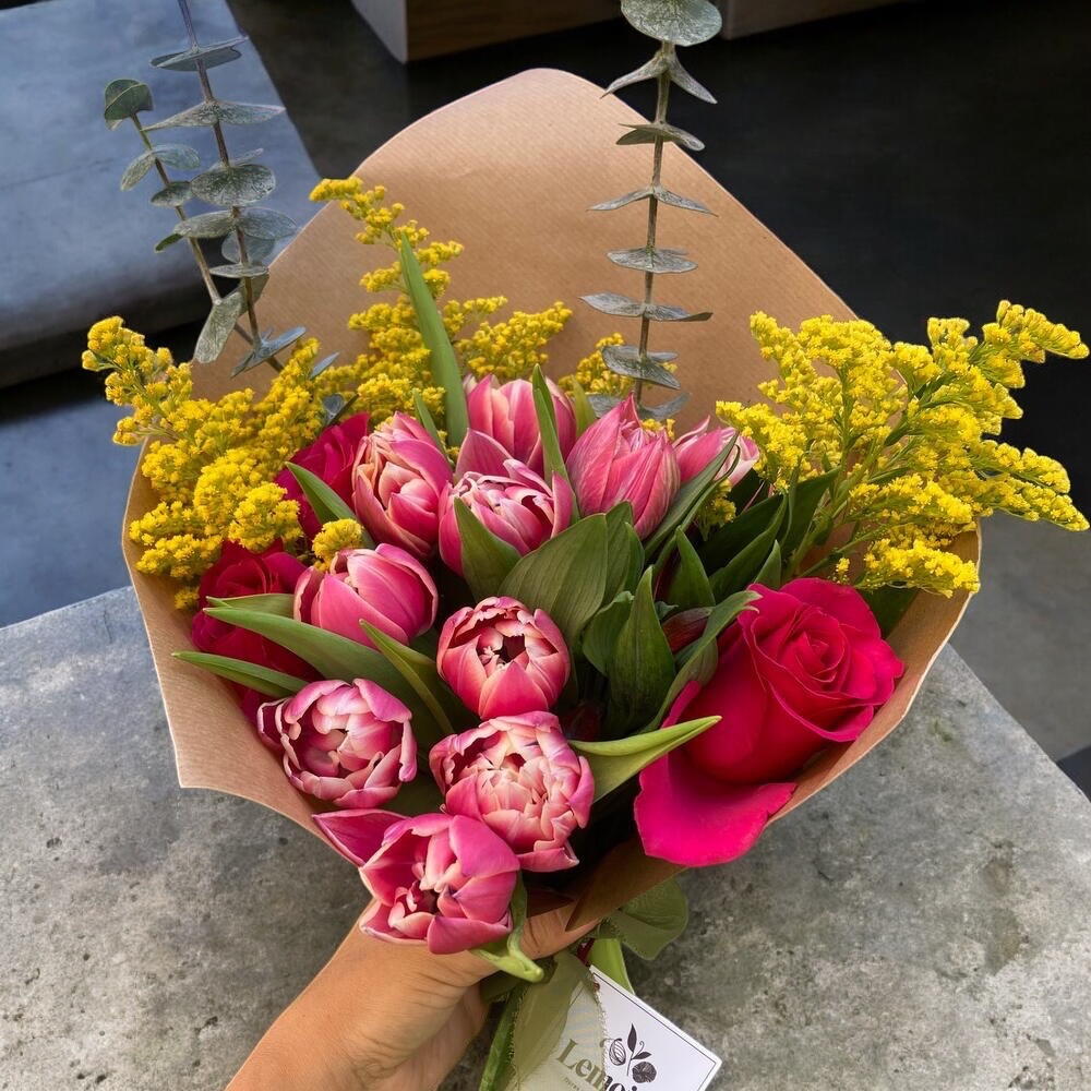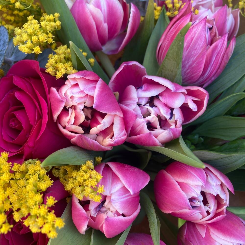 Цей прекрасний букет поєднує елегантність рожевих тюльпанів з інтенсивністю фуксійних троянд, створюючи яскравий і чарівний контраст. Теплі тони жовтого золотарника додають нотку сяйва, а евкаліпт надає свіжості та природності. Ідеально підходить для святкування особливих моментів або щоб освітлити чиєсь день, ця квіткова композиція є справжнім відображенням весни.