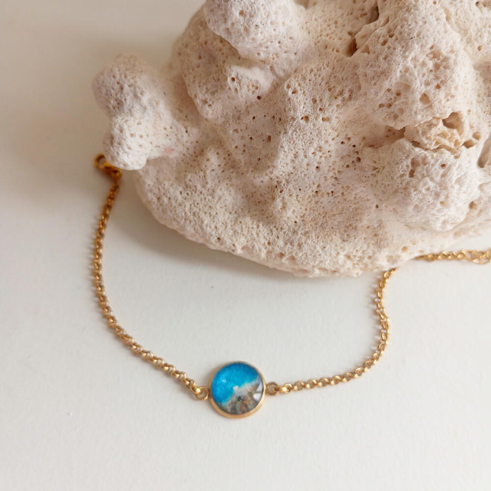 Гарний браслет, який подарує вам силу та спокій моря. Одна сторона має ручну роботу з використанням смоли та середземноморського піску. Інша сторона виготовлена з позолоченої нержавіючої сталі, на якій можна вигравірувати імена та ініціали. Гарний, унікальний та особливий подарунок... Візьміть із собою частинку моря! І персоналізований іменами чи чим завгодно!