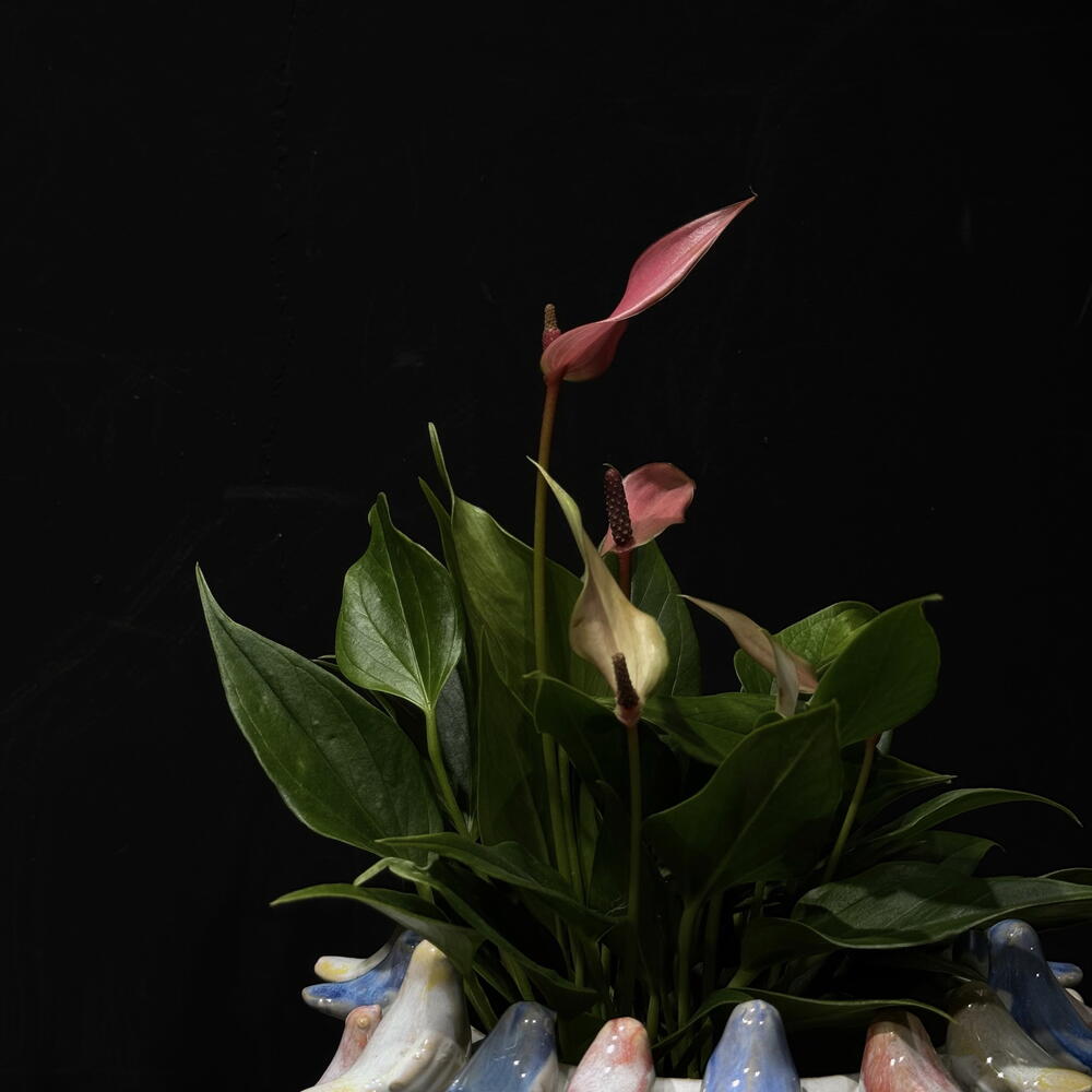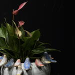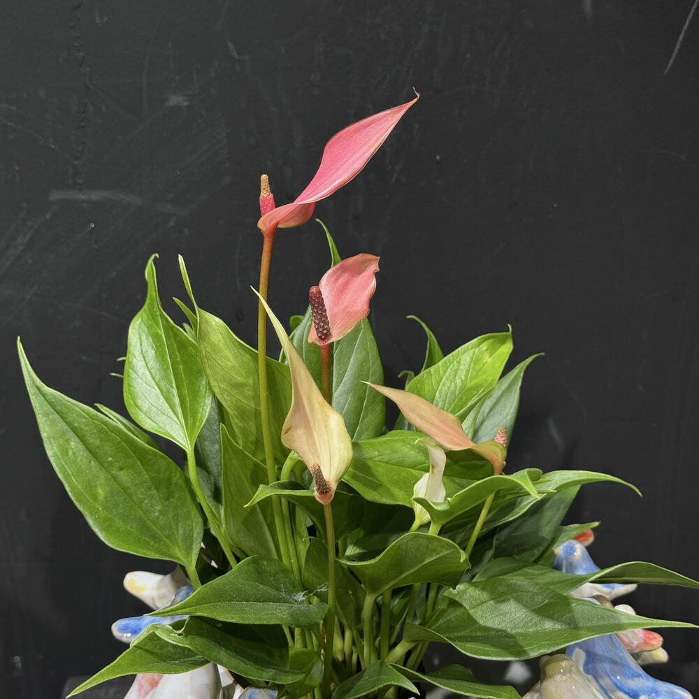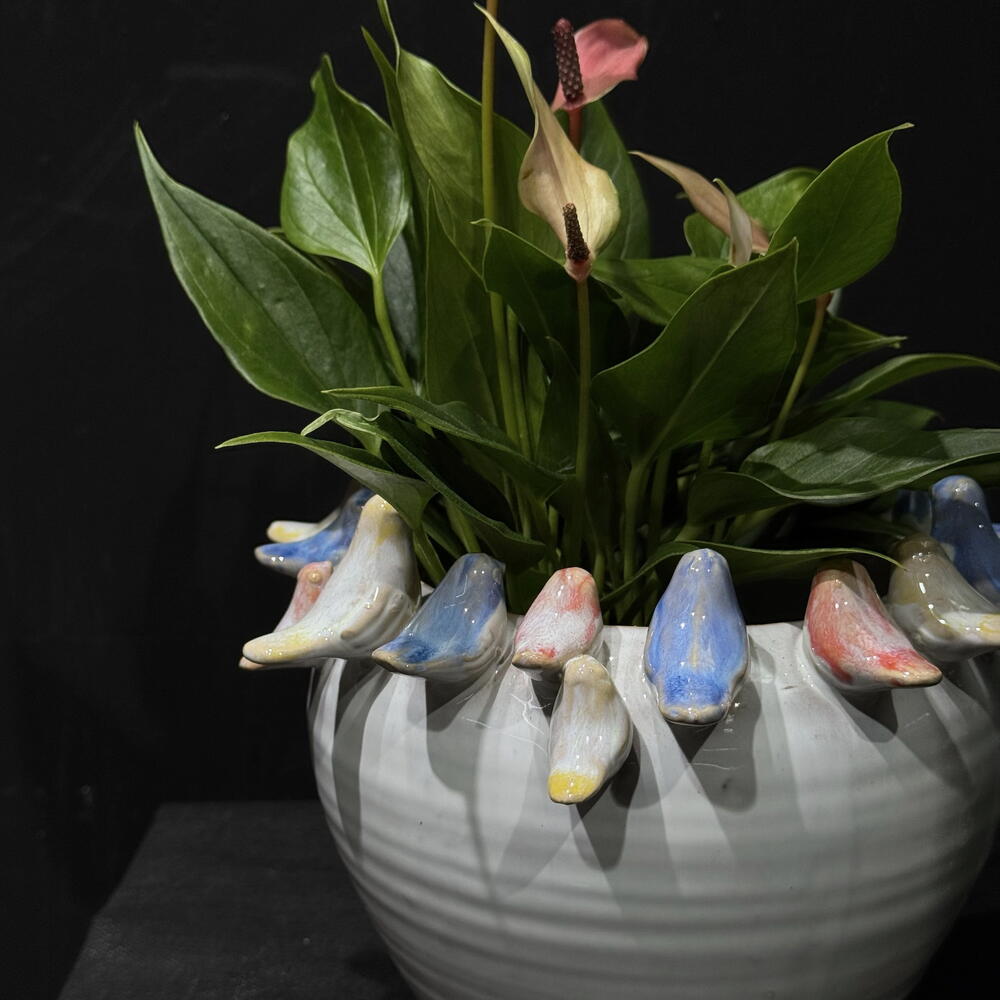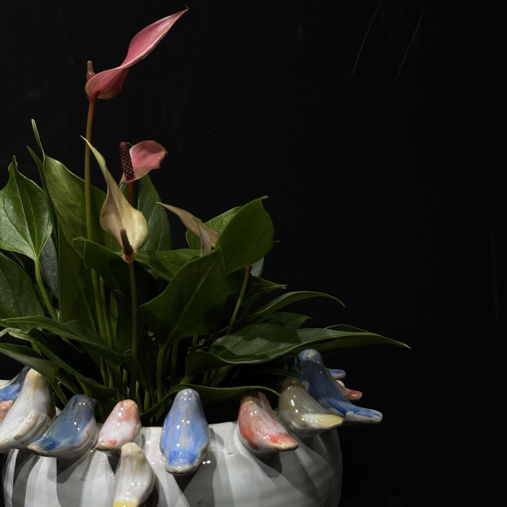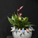 Spathiphyllum en maceta de cerámica blanca con delicados pajaritos en tonos pastel, una композиción elegante que aporta frescura y un toque artístico a cualquier espacio. Ideal para interiores y fácil de cuidar. La planta: Spathiphyllum rosado. Maceta decorativa con pajaros (15x15cm). *La planta y la maceta también se venden por separado.