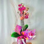Орхідея фаленопсис кольору фуксії зачаровує своїми насичено барвистими квітами та елегантними гілками. Композицію доповнюють декоративні сухі гілочки та мила пташка, яка додає їй веселого та унікального вигляду. Загорнута в рожевий папір з барвистими візерунками та білою стрічкою, вона ідеально підходить для подарунка на дні народження, річниці або для оживлення будь-якого інтер'єру.