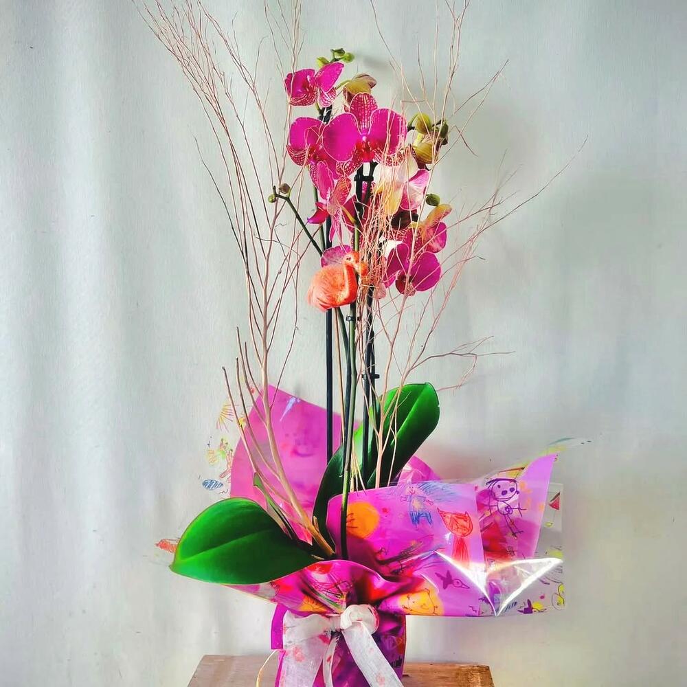 Орхідея фаленопсис кольору фуксії зачаровує своїми насичено барвистими квітами та елегантними гілками. Композицію доповнюють декоративні сухі гілочки та мила пташка, яка додає їй веселого та унікального вигляду. Загорнута в рожевий папір з барвистими візерунками та білою стрічкою, вона ідеально підходить для подарунка на дні народження, річниці або для оживлення будь-якого інтер'єру.