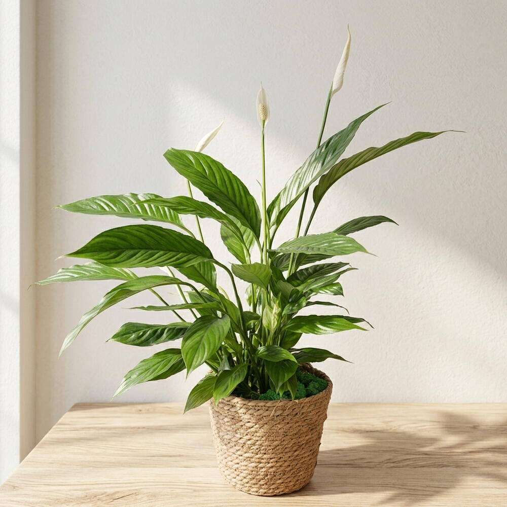 Esta elegante planta Spathiphyllum destaca por su belleza natural y su simbolismo de paz y armonía. Sus hojas verdes y brillantes crean una base exuberante, mientras que sus delicadas flores blancas aportan un toque de pureza y serenidad. Es ideal para decorar interiores, llenando el espacio de frescura y calma. Su presencia transmite equilibrio y bienestar, convirtiéndola en una opción perfecta tanto para el hogar como para la oficina. Además, es conocida por su capacidad de mejorar el ambiente, aportando una sensación de limpieza y tranquilidad. Su maceta decorativa realza su estilo natural y sofisticado. Una planta que combina sencillez y elegancia en cada detalle.