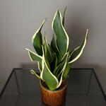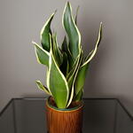 Lamaceeta podria variar. Sansevieria trifasciata, también conocida como “Lengua de suegra” o “Espada de San Jorge”, es una planta resistente y elegante con hojas alargadas de color verde oscuro con bordes amarillos. Es ideal para interiores gracias a su capacidad de purificar el aire y su bajo mantenimiento.