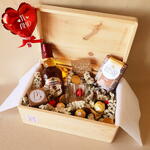 toblerone міні - 2 шт. шоколадні цукерки ferrero rocher - 3 шт. плитка шоколаду ferrero rocher - 1 шт. шоколадні монети - 4 шт. бонбони у формі серця - 3 шт. склянка для віскі - 1 шт. коробочка з сюрпризом - 1 шт. пляшка віскі chivas 35cl - 1 шт. повітряна кулька з написом «te amo» - 1 шт.